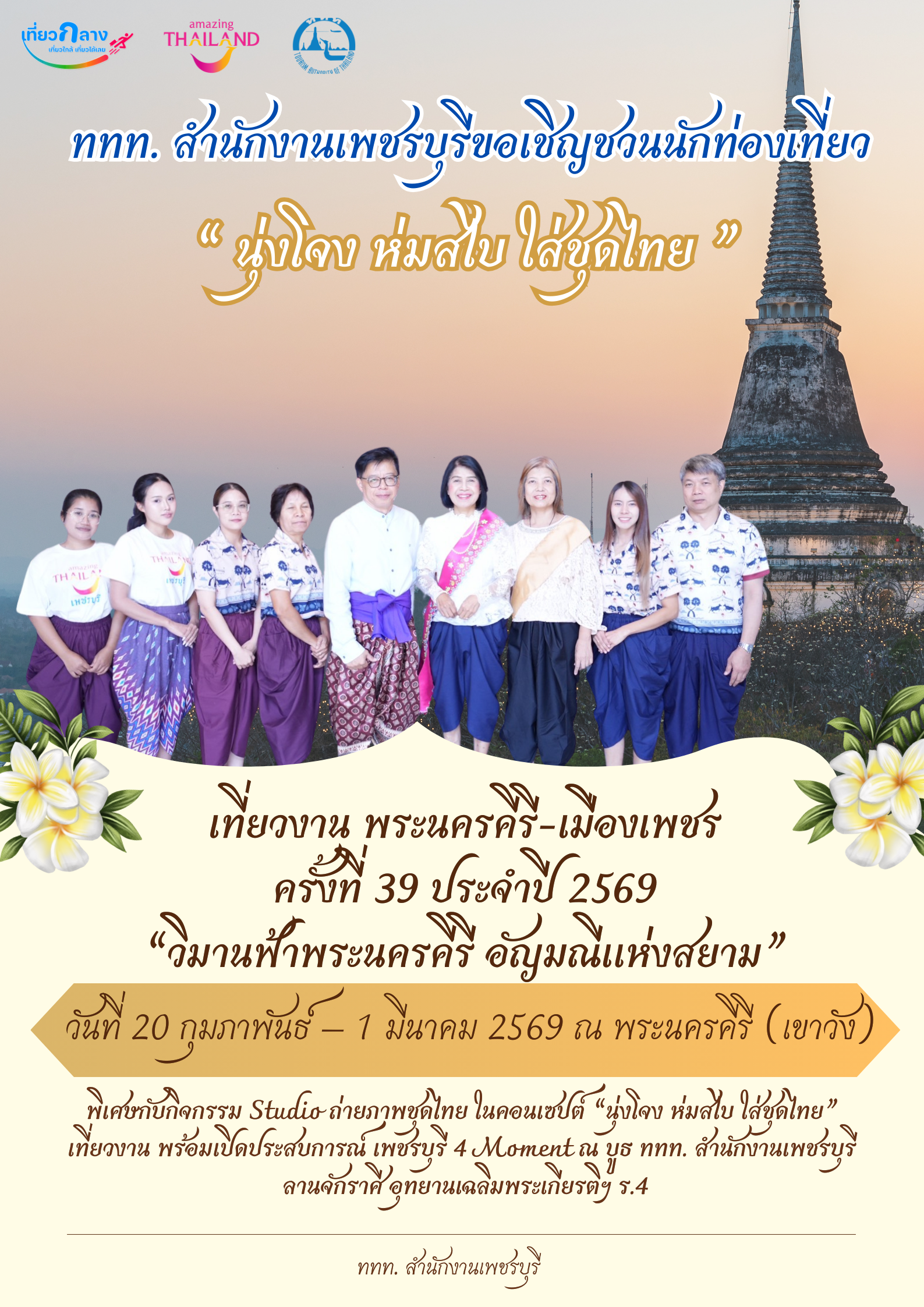 เตรียมสะบัดสไบ พับโจงให้เนี้ยบ! การท่องเที่ยวแห่งประเทศไทย (ททท.) สำนักงานเพชรบุรี พร้อมเปิด “ประตูเมืองเพชร” พาทุกท่านข้ามกาลเวลาไปสัมผัสเสน่ห์ยุคทอง ในงาน “พระนครคีรี-เมืองเพชร ครั้งที่ 39” ปี 2569 ที่จะเปลี่ยนเขาวังให้กลายเป็น “วิมานฟ้าพระนครคีรี อัญมณีแห่งสยาม” อันตระการตา