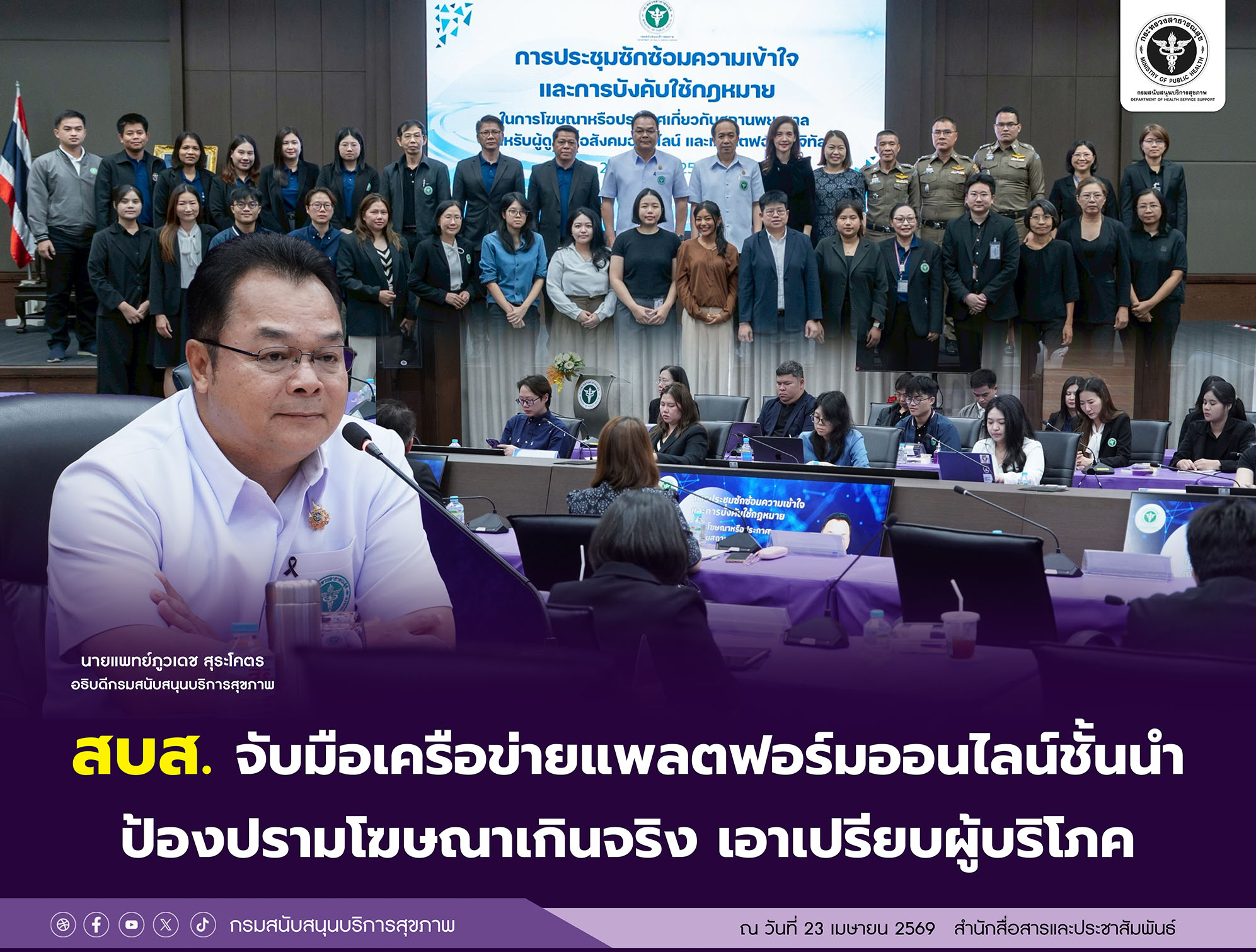 วันนี้ (23 เมษายน 2569) ณ อาคารกรม สบส. กระทรวงสาธารณสุข จังหวัดนนทบุรี นายแพทย์ภูวเดช สุระโคตร อธิบดีกรม สบส. เป็นประธานเปิดการประชุมซักซ้อมความเข้าใจและการบังคับใช้กฎหมายในการโฆษณาหรือประกาศเกี่ยวกับสถานพยาบาล สำหรับผู้ดูแลสื่อสังคมออนไลน์ และแพลตฟอร์มดิจิทัล